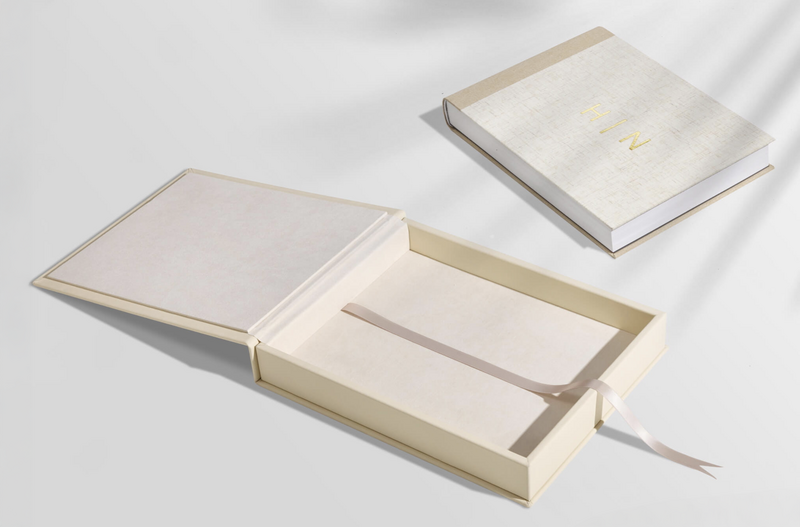 Add a Leatherette, genuine leather or linen box to display and preserve your album. Customize the cover and side panels with your choice of materials, matching the interior for a cohesive look or selecting a contrasting shade for added interest. Finish it off with a ribbon color that ties the whole design together.